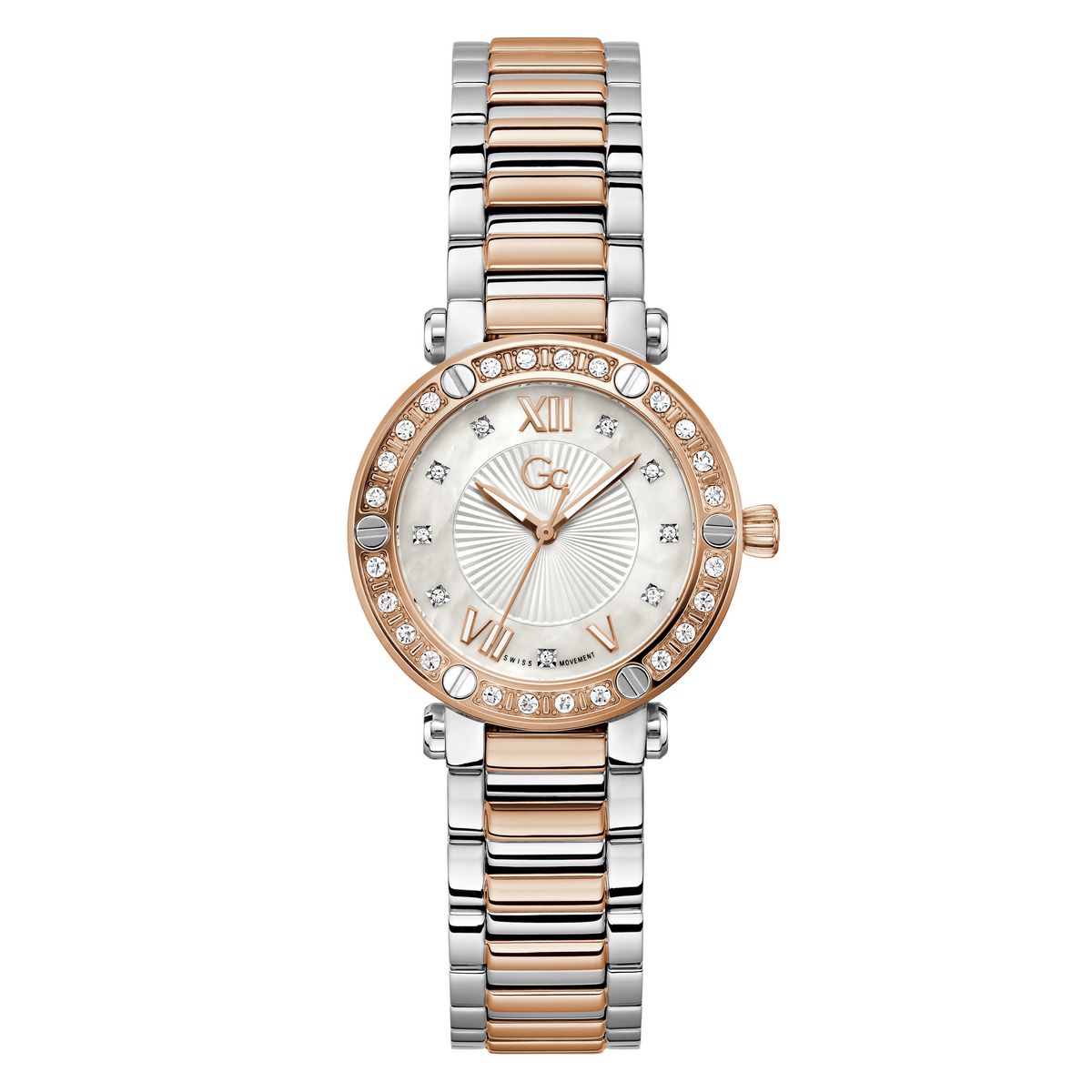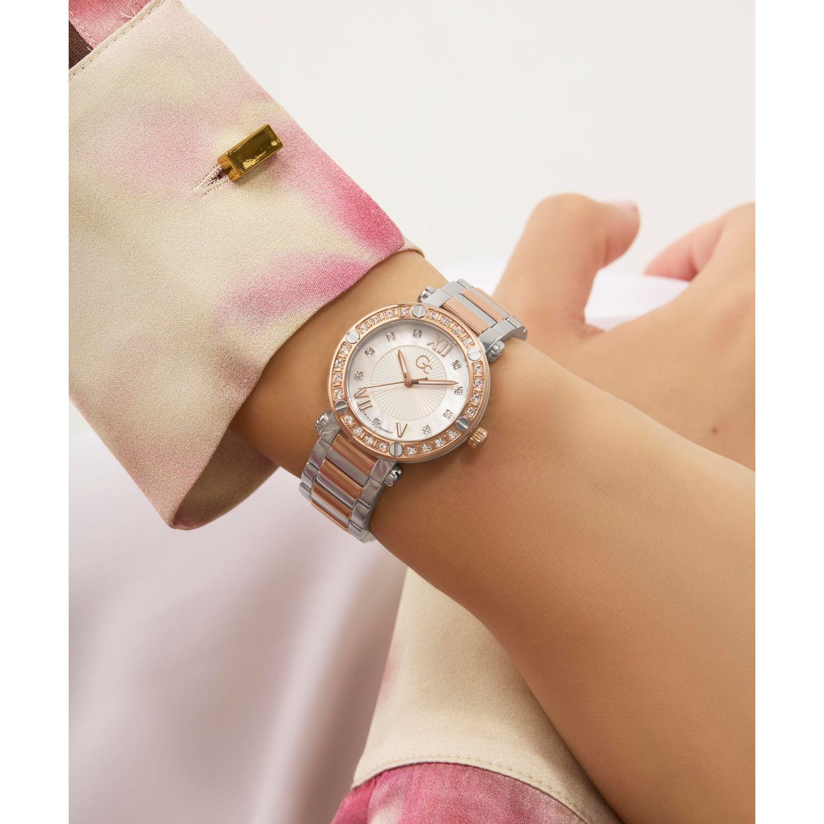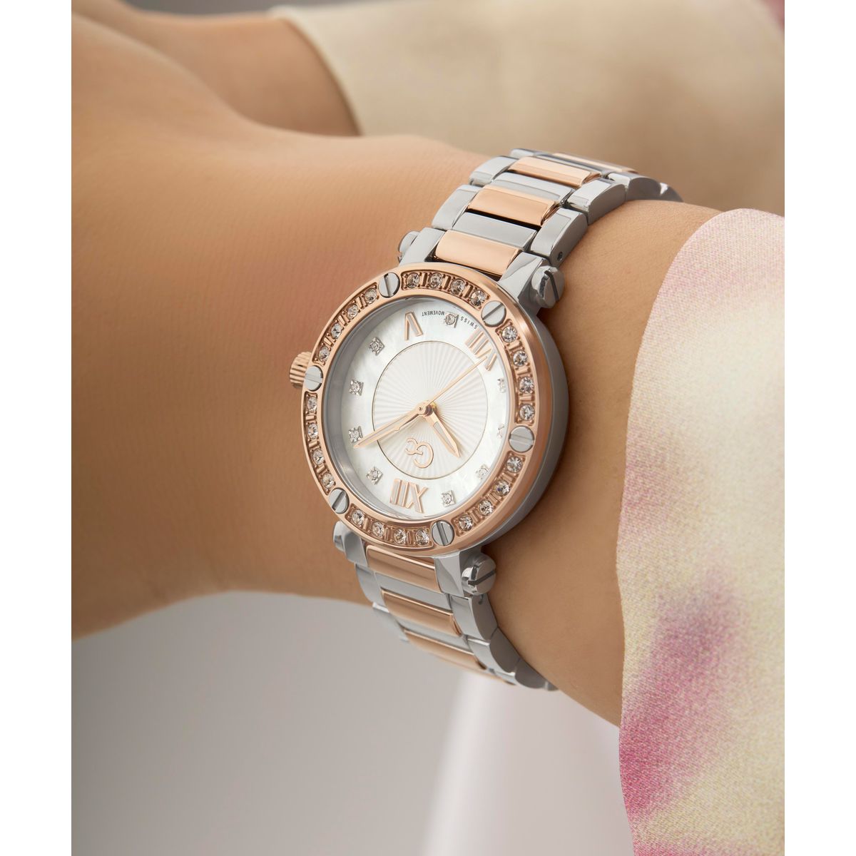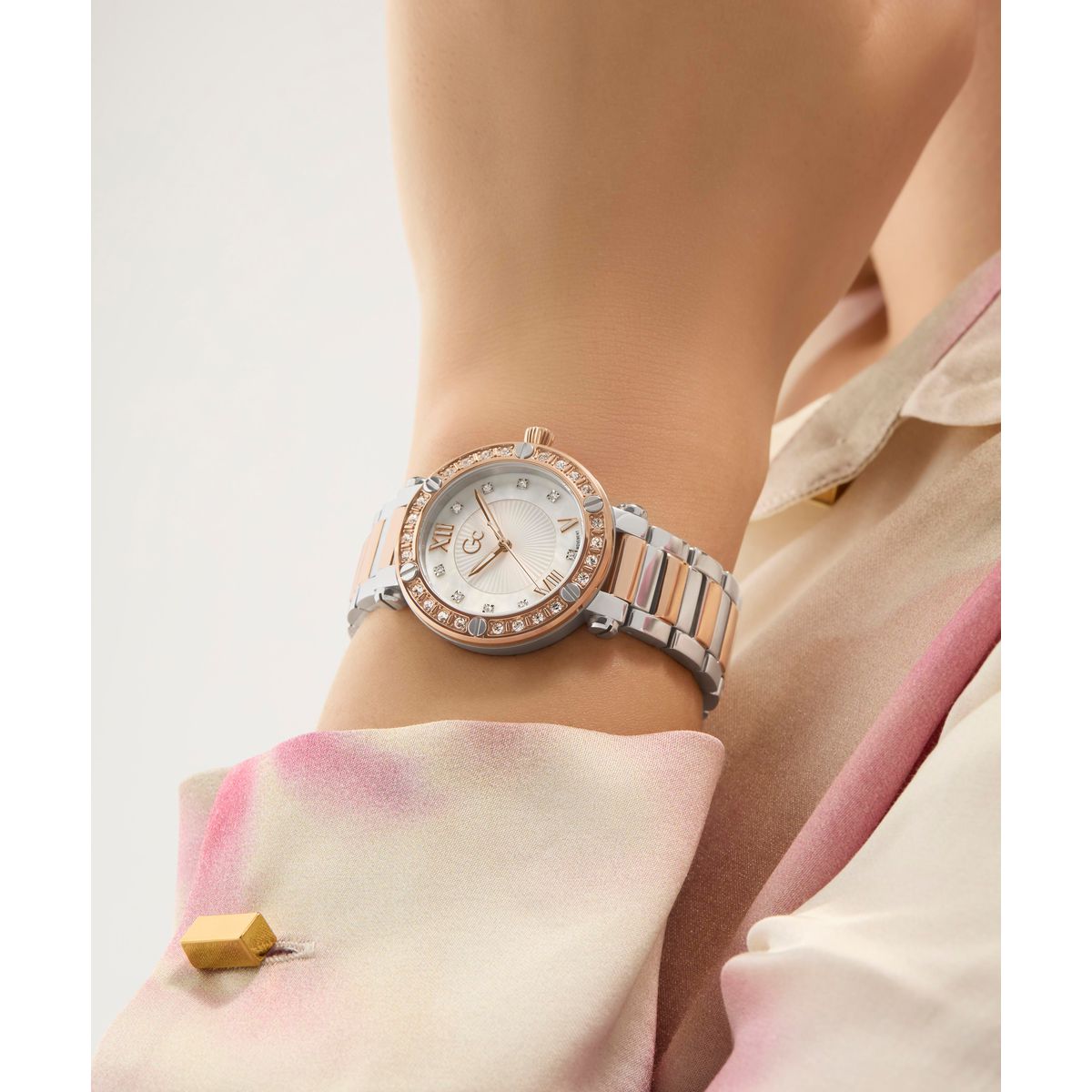 - Special Feature:- Polish your daily appearance with the Gc Aura in a small size, featuring a mix of screws and crystals on the top ring. The two-tone silver & rose Gold PVD case is paired with an eco-friendly white mother-of-pearl dial decorated with central texture and crystal indices. With its emblematic T-bar construction, the bracelet offers a casual refined look and comfortable wear.